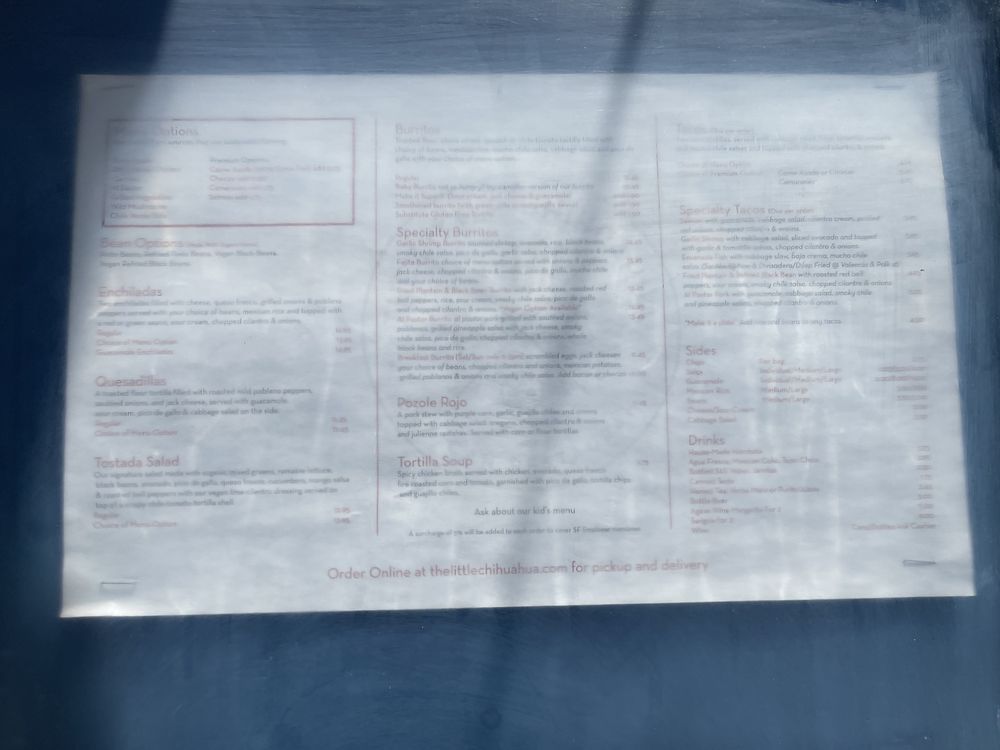 The Little Chihuahua, a Mexican restaurant located in San Francisco, offers a diverse menu with options for pescatarians, vegetarians, and vegans. The aperitivos include Guac & Chips, Fried Plantains, Chilaquiles, and various quesadillas, perfect for sharing or as a main course. Beverages range from Still Water to Jarritos to Beer & Wine, enhancing the dining experience. Customers rave about the friendly staff, quick service, and well-packaged to-go orders. While some reviews mention the food being average in taste, others highlight the delicious Al Diablo burrito and refreshing pineapple agua fresca. The restaurant's commitment to sustainability is evident through its use of compostable containers and plastic-free packaging. Overall, The Little Chihuahua provides a casual yet classy atmosphere for a quick, healthy Latin meal experience in San Francisco.